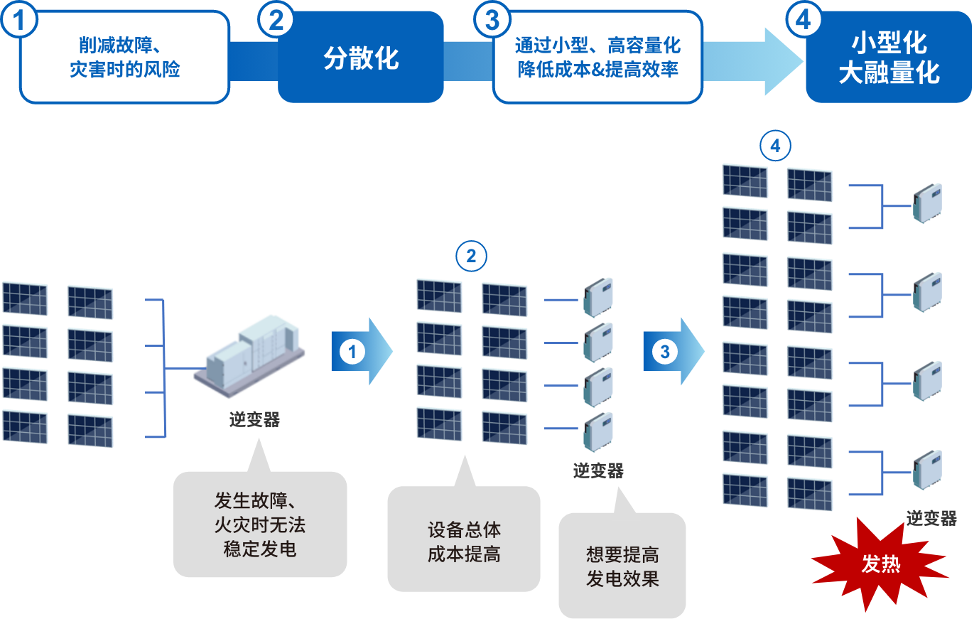 近年來,太陽能發(fā)電系統(tǒng)上的需求不斷發(fā)生變化。作為地震或水災等災害風險對策,更加穩(wěn)定的電力供給需求愈發(fā)高漲,并出現(xiàn)了從集中型系統(tǒng)向分散型系統(tǒng)轉(zhuǎn)化的趨勢。并非通過1臺光伏逆變器執(zhí)行電力轉(zhuǎn)換,而是分散至多臺光伏逆變器,由此降低了發(fā)生災害時因設(shè)備故障等所致發(fā)電停止的風險。此外,各設(shè)備或機器上通過高容量、大電流化的配置提高了發(fā)電效率,并通過小型化、輕量化削減了設(shè)備投資,因而要求有效利用設(shè)備的呼聲愈發(fā)高漲。而另一方面,伴隨小型化、高容量化的發(fā)展,當務之急是減少設(shè)備本身產(chǎn)生的熱量,這是造成能量損失和降低設(shè)備使用壽命的一個因素。