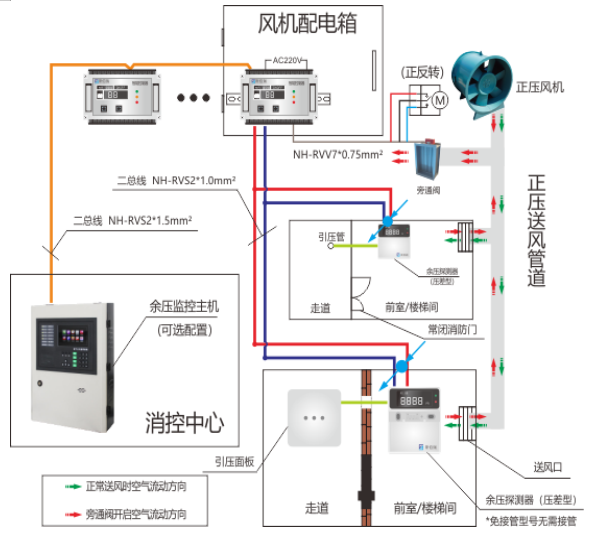2, 余壓監(jiān)控系統(tǒng)通過(guò)余壓探測(cè)器實(shí)時(shí)監(jiān)測(cè)余壓值(前室/走道或樓梯間/走道氣壓差值), 當(dāng)余壓值超過(guò)報(bào)警設(shè)定值(前室30Pa, 樓梯間50Pa),余壓探測(cè)器將發(fā)出報(bào)警信號(hào),同時(shí)聯(lián)動(dòng)余壓控制器控制旁通閥開啟,減少正壓風(fēng)機(jī)前室或樓梯間的送風(fēng)量,降低前室或樓梯間余壓值。