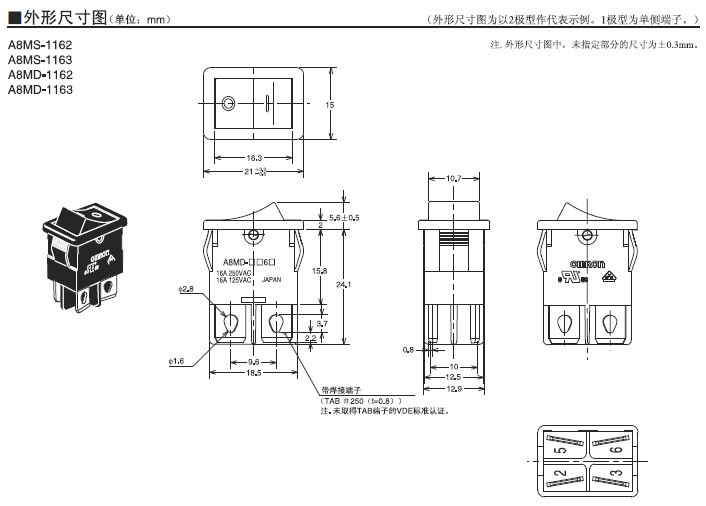 實現(xiàn)16A開關性能的小型船形開關 小型、16A的開關性能。 可進行一觸式安裝。 符合UL、cUL認證,EN標準適用品。