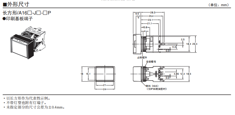 印刷基板端子型 操作桿部采用了耐高溫樹脂,可實現自動焊接。 面板和印刷基板的安裝方法簡單。 通過開閉操作桿,可輕松拆卸插座部。 可從印刷基板內側確認保持狀態。 分離式實現了進深28.3mm的短尺寸。可縮短面板進深。