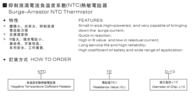TC熱敏電阻器:是以錳、鈷、鎳和銅等金屬氧化物為主要材料,采用陶瓷工藝制造而成的。NTC熱敏電阻器在室溫下的變化范圍在10°歐姆~10⒍歐姆,溫度系數(shù)-2%~-6.5%。它具有電阻值隨溫度的上升而下降的特性。適用于轉(zhuǎn)換電源、開關(guān)電源、UPS電源、各類電加熱器、電子節(jié)能燈、電子鎮(zhèn)流器、各種電子裝置電源電路的保護(hù)以及彩色顯示管、白熾燈及其他照明燈具的燈絲保護(hù)。